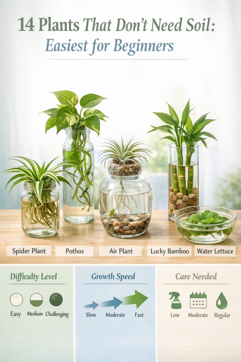 For most beginners, the easiest picks from these 14 plants that dont need soil are lucky bamboo, pothos, spider plant, philodendron, and air plants. These plants tolerate small mistakes and adapt well to indoor conditions.