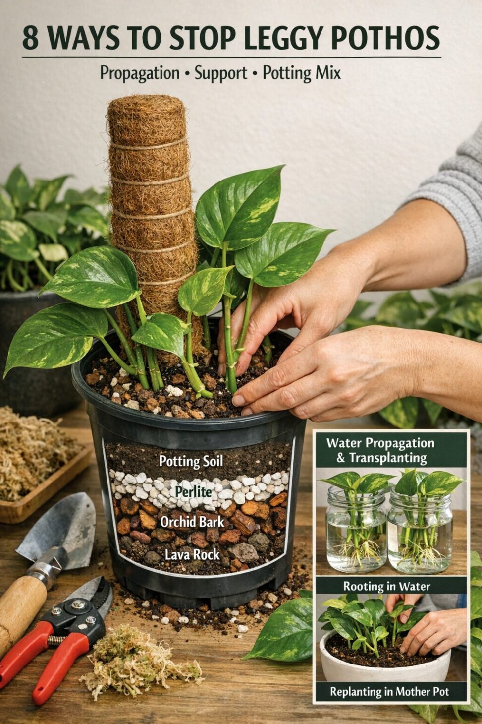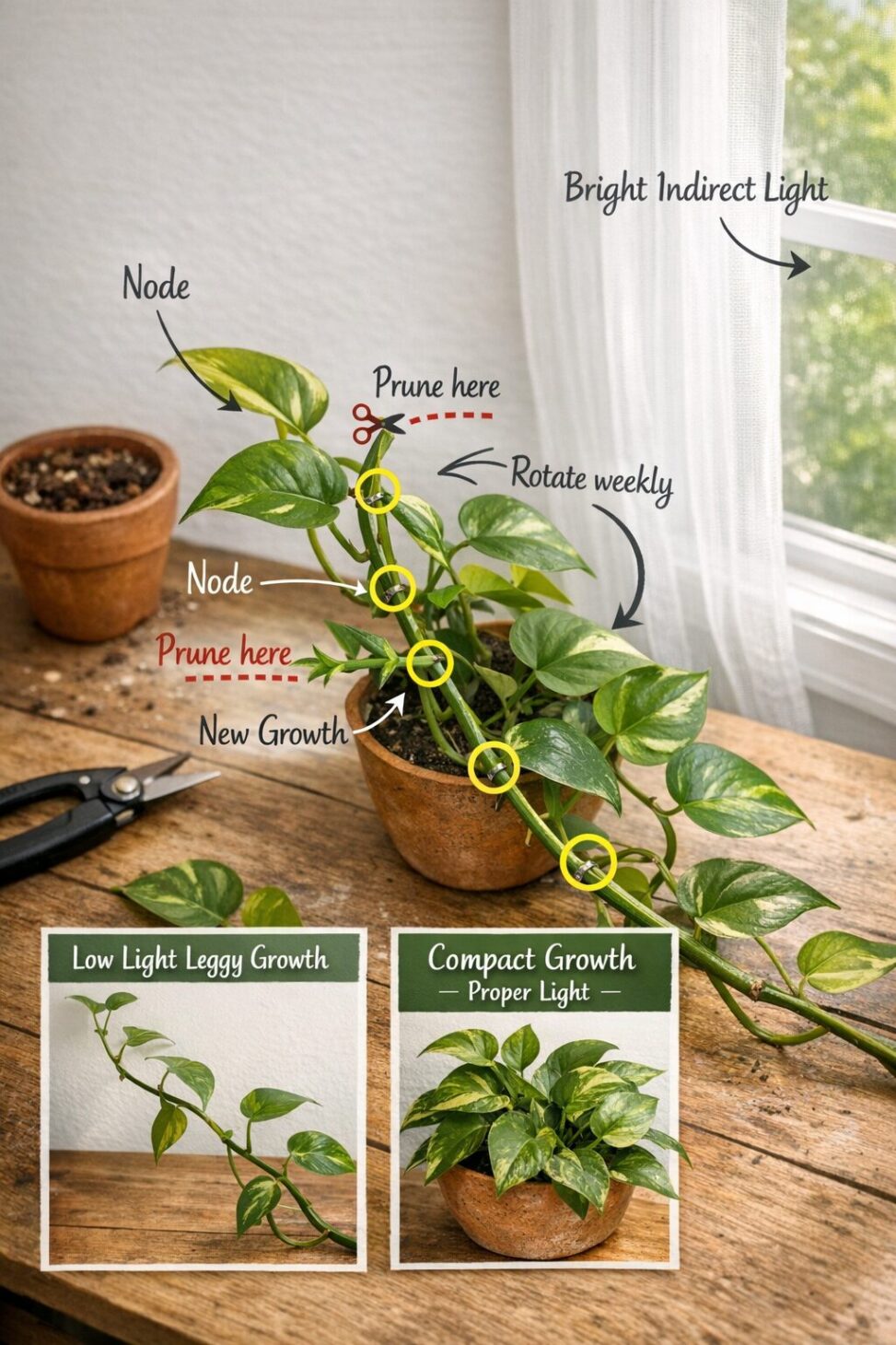 The 8 ways to stop leggy pothos are practical and work best together. Start with light and pruning, then improve the setup so new growth stays full instead of stretching again.